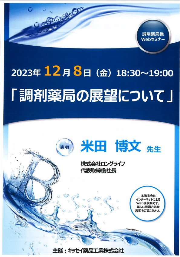 キッセイ薬品工業株式会社主催のWebセミナーにて弊社代表取締役社長米田博文が登壇しました 2023-12-08 企業情報 キッセイ薬品工業株式会社主催のWebセミナーにて代表取締役社長米田が「調剤薬局の展望について」をテーマに業界の今後の流れに対して、我々中小薬局がどう立ち向かっていくかをお話しさせて頂きました。当日は愛知県や神奈川県など県外の薬局の方を中心にご視聴頂きました。
